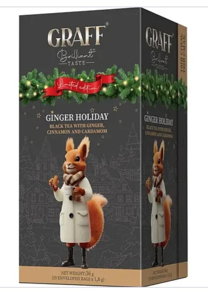 Чай Graff "Імбирне свято" — це насичений чорний байховий чай із додаванням імбиру, кориці та кардамону, що створює пряне й зігріваюче поєднання смаків. Ідеальний для зимового сезону, цей чай дарує багатий аромат спецій, де імбир забезпечує приємну пікантність, кориця додає теплоту, а кардамон — тонкий пряний акцент. "Імбирне свято" чудово підходить для моментів відпочинку і допомагає відчути справжній зимовий затишок. Рекомендується вживати з медом або часточкою лимона для ще більш яскравого смаку