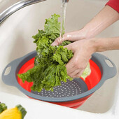 Складной дуршлаг силиконовый легко моется в посудомоечной машине, удобен в применении и компактен в хранении. Подходит для работы с холодными и горячими продуктами.