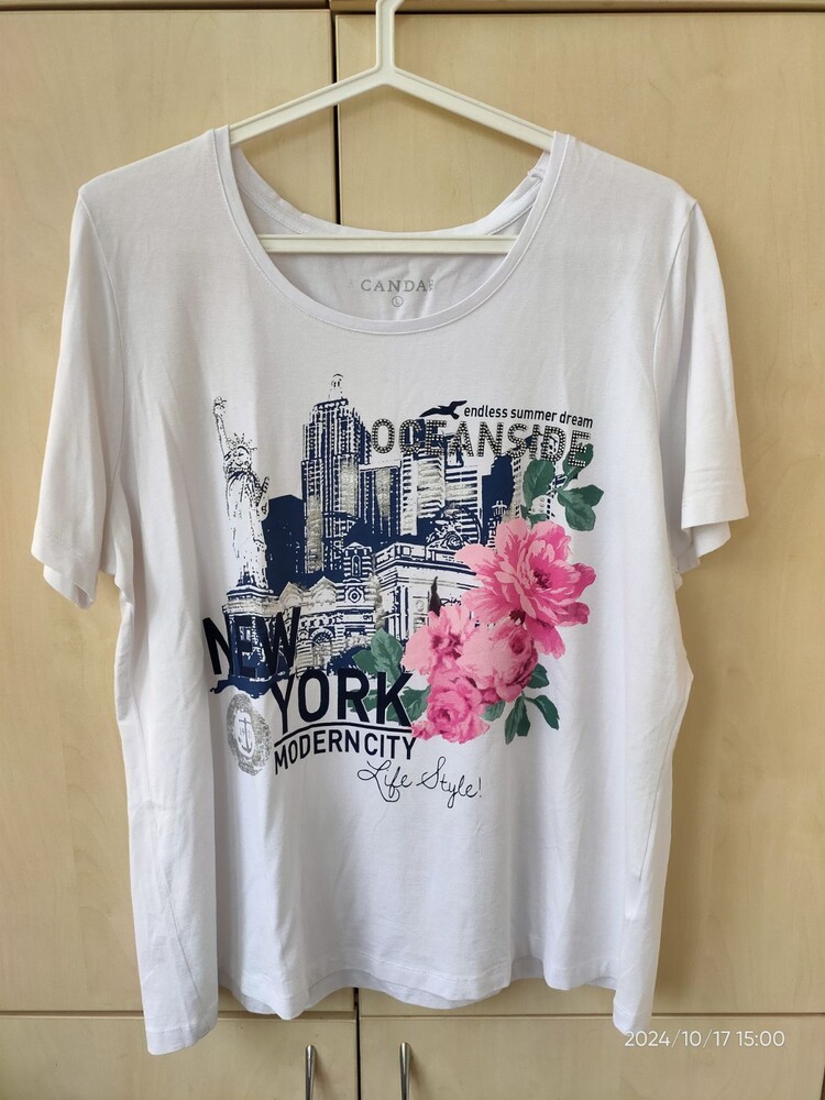 Футболка р-р L віскоза. Виміри: напівобхват грудей 57, напівобхват талії 54, напівобхват стегон 60, довжина 63. На принті та написі використані маленькі стразики. Стан чудовий, без дефектів.
