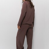 Гармонія елегантності та комфорту! У цьому костюмі коричневого кольору є все, що ти шукала! Модель виконана зі щільного трикотажу з гладкою лицьовою стороною, що нагадує костюмну тканину. У комплекті прямі штани йдуть на широкій гумці вгорі та з прямими краями внизу. Для більшого комфорту пояс доповнений шнурком, а у бічних швах вгорі розташовані прорізні кишені. У кофтинці довгі рукави-реглани по центру прикрашені вертикальним швом. Краї низу у виробі прямі, горловина кругла.