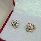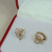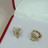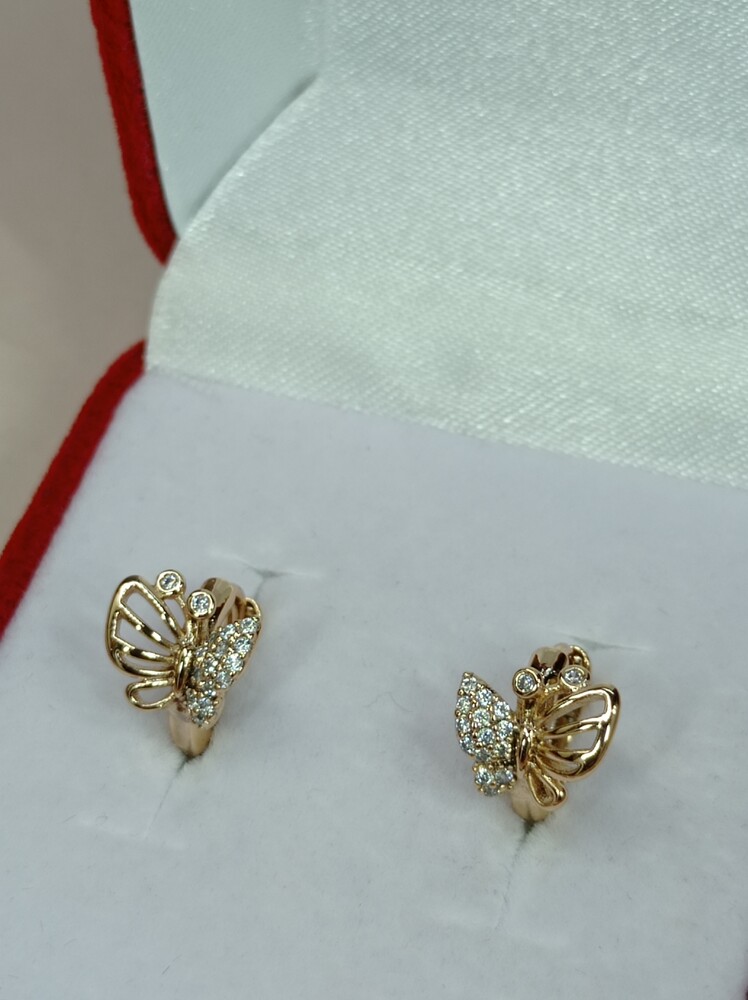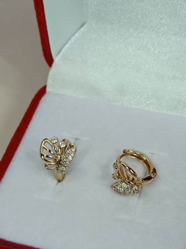 Красивые детские серьги бабочки с белыми фианитами. Позолота 585 пробы 18К. Размер 1,1*0,9 см. Диаметр 1 см.
