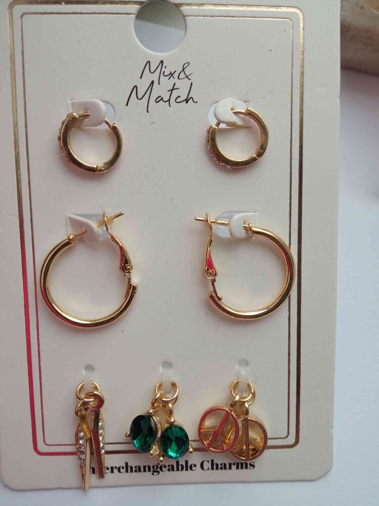 Цей універсальний набір сережок створений для тих, хто не любить вибирати між стилями. Усередині — дві пари базових кілець (маленькі з камінцями та середні гладкі) + 3 пари підвіски-оберіга: блискуча блискавка, зелені кристали та знаки світу. Міняй за настроєм, комбінуй, експериментуй — щодня можеш бути різною!