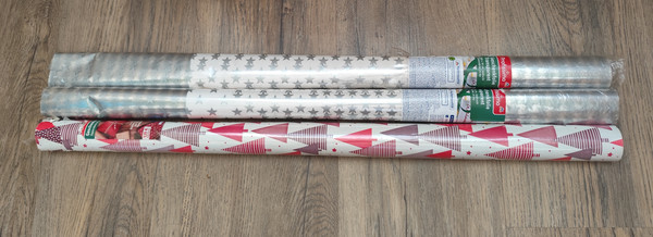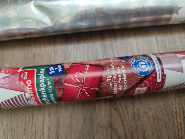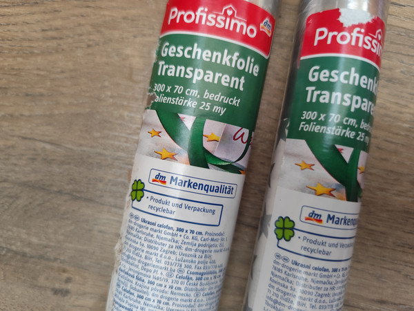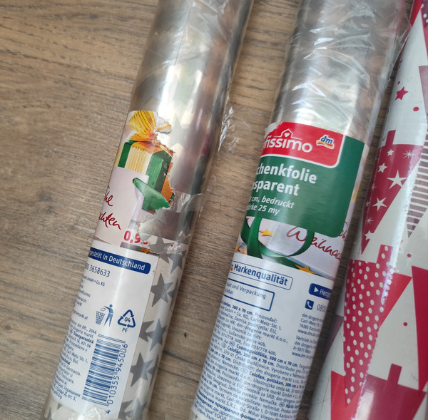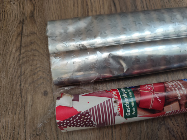 якісний подарунковий папір+плівка (для пакування подарунків) передали з Германії, розміри - на фото, з одного боку рулони пошкодили при перевозці - рвані або сплющені, краще буде зрізати сантиметрів 5. Попрошу на коробку