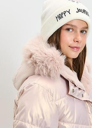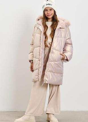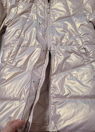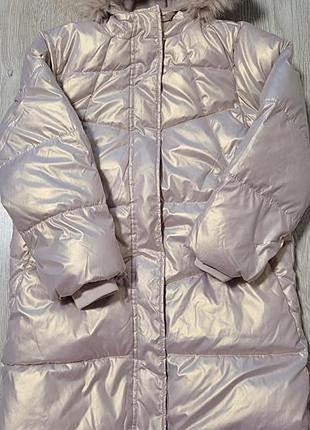 Дуже красиве і тепле пальто для дівчинки.Колір - рожеве золото.Розмір - на зріст 152 см.Прихована планка.Розтібається і знизу також, що дуже зручно.Водовідштовхувальний матеріал.