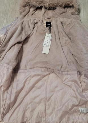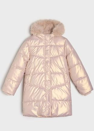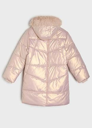 Дуже красиве і тепле пальто для дівчинки.Колір - рожеве золото.Розмір - на зріст 152 см.Прихована планка.Розтібається і знизу також, що дуже зручно.Водовідштовхувальний матеріал.
