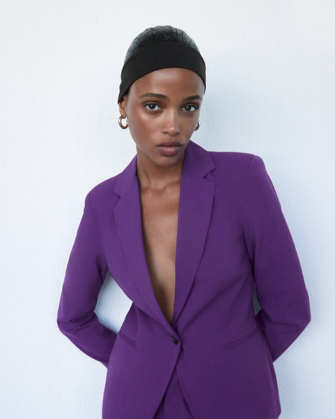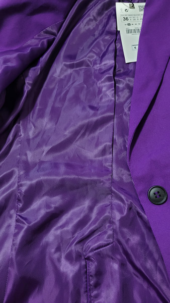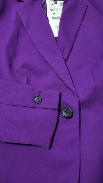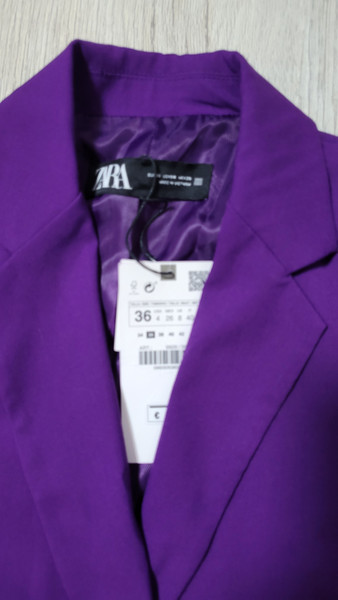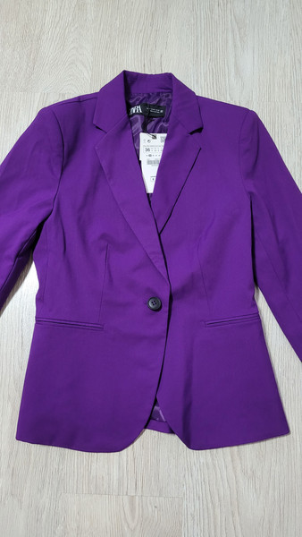 Шикарный фиолетовый блейзер от испанского бренда Zara.Качество супер !Ткань гладкая, ничего не цепляется.На подкладке.36 размер.Состав : 63% полиэстер, 3% вискоза, 4% эластан.Подкладка: 100% полиэстер.Пиджак с подплечниками.ПО под руками 45 смПОТ 41 смПО по низу 49 смПлечи 39.5 смРукав 62 смРукав по низу 45 смДлина 60 см
