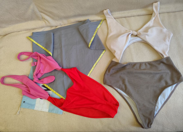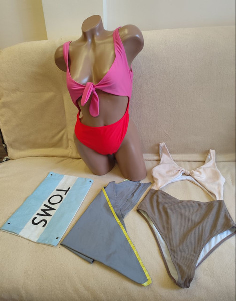 дуже гарні купальники, особливо той що в рубчик - колір, матеріал, чашечки, фасон все ідеальне, мені завелике вказано р.М, по факту Л +також додам яскравий купальник на розмір Л (на манекені вони не гарно виглядають, бо великі розміри), також дуже класна косинка на пляжах та щільний мішечок для пляжних речей чи взуття, ще зручно для мокрих речей - все в стані нового! Попрошу на пакування