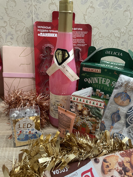 Вітаю з подарунком! Але... багато питань... Що в рожевій коробці, пляшка з чим? Зелена коробочка також не зрозуміло що там