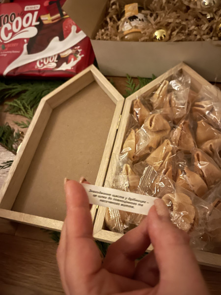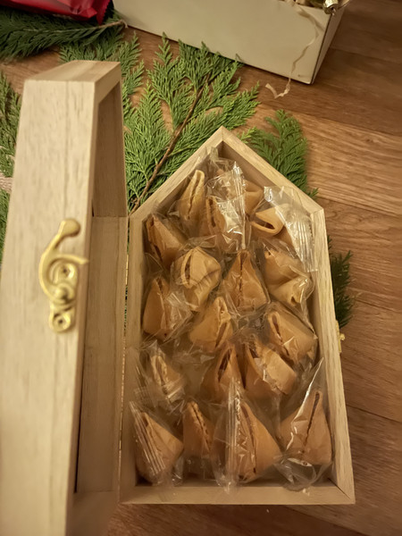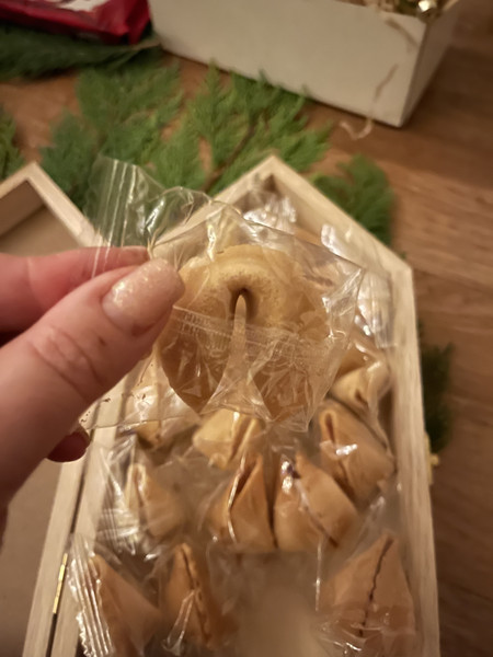 Це ж печиво з побажаннями. І його у нас дуууууже багато. Воно і в скринці, і на ялинці....Ледь відбилися від Тайруші)