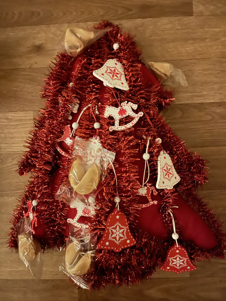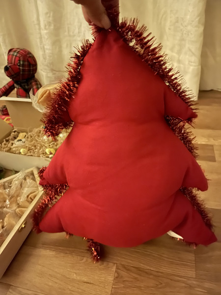 Далі- ялинка. Це просто диво якесь! Це подушка у формі ялинки, але Снігуронька у мене настільки талановита і творча, що вона з цієі чудовоі подушки зробила витвір мистецтва. Дивіться: