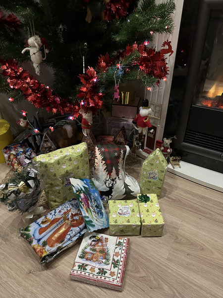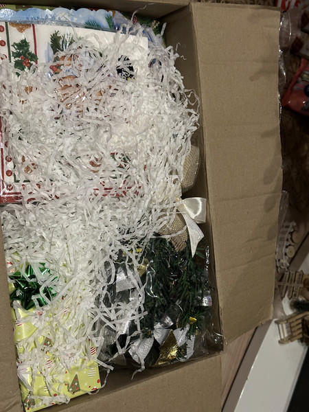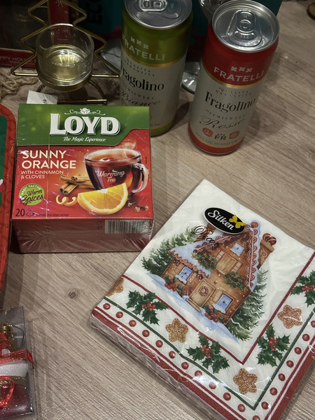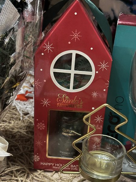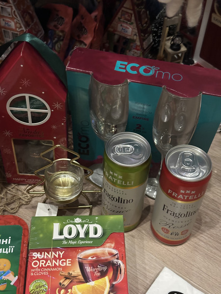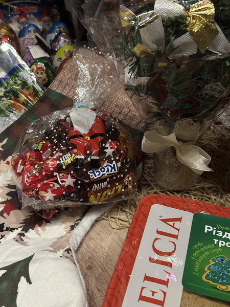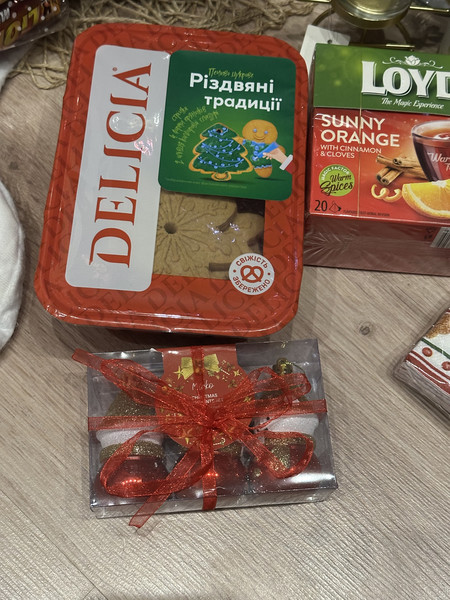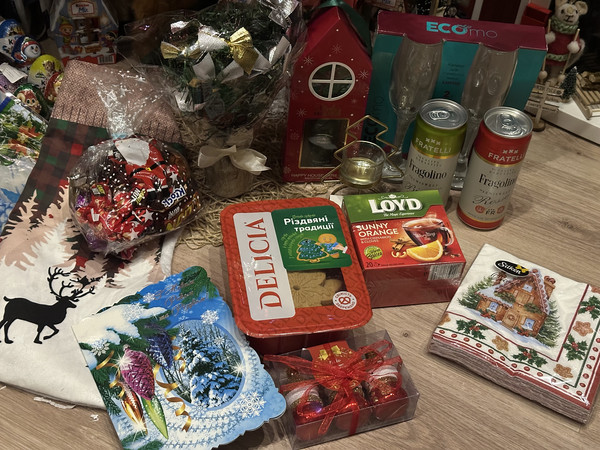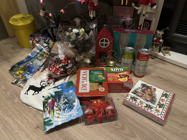 Потихеньку розпакували і знайшли в шкарпетці цукерочки та фраголіно, потім 2 бокали для нього, новорічні серветки, чайок та печиво, прикраси на ялинку у вигляді сніговичків, набір для душу(гель і мочалка) в різдвяній тематиці, дуже красивий підсвічник-ялиночка і декоративна ялиночка у відрі, а також листівка з побажаннями.