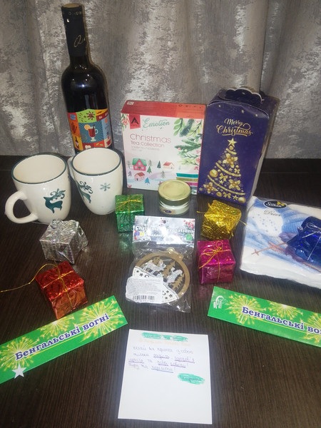 Вітаю, такий домашній і милий подарунок, серветки "дьоргається глаз", я розцінюю як продовження турботи))), видно, що людина старалась, ліпила всі наліпки, ну тобто план був і він реалізувався. Вітаю Вас з Новим Роком!