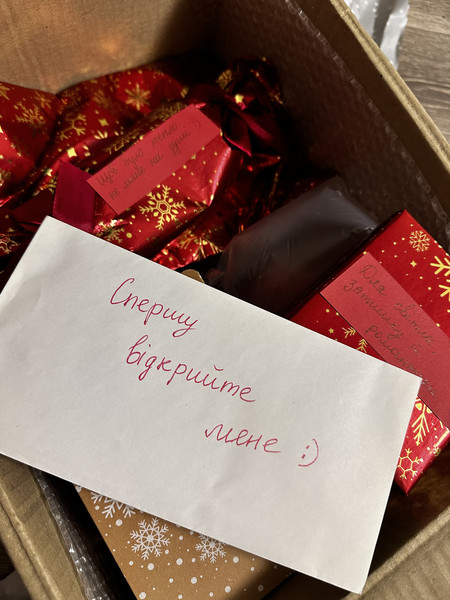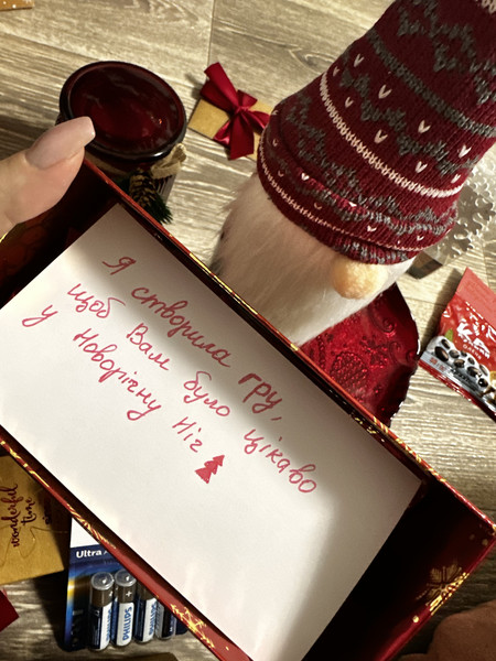 Подарунок вразив всим, спочатку розміром, потім написом "пусті банки" під обгорткою, далі шикарним пакуванням і звичайно не менш - шикарним вмістом! Все дуже сподобалося - від ніжної гірлянди до ароматної новорічної свічечки, але гра, яку нам вигадала Снігуронька - це той креативний креатив, якого так хотілося в першу чергу. Ну, лише уявіть, як дві дорослі людини у новорічну ніч показують один одному пантоміми коня, який підсковзнувся на льоду або іграшки, якій не подобається висіти на гілці) Цей подарунок запамʼятається надовго. Дуже дякуємо вам, Вірочка, за нашу веселу новорічну ніч!