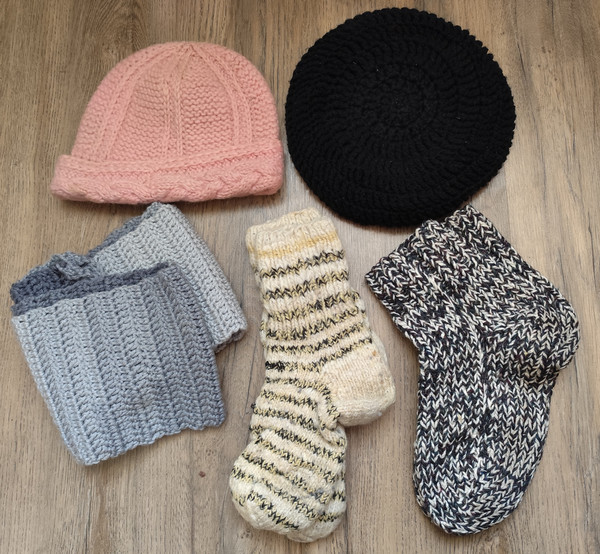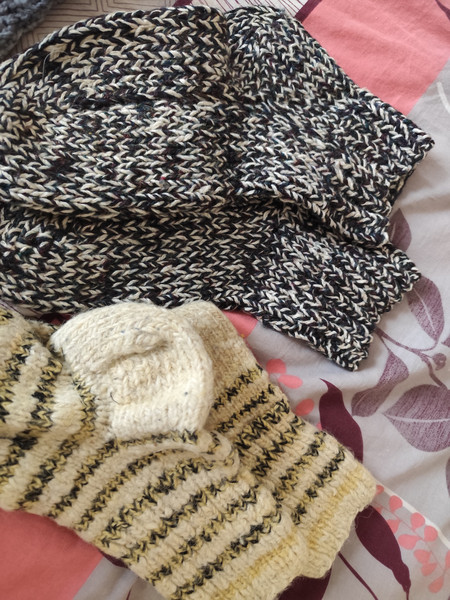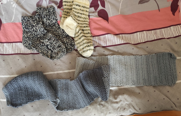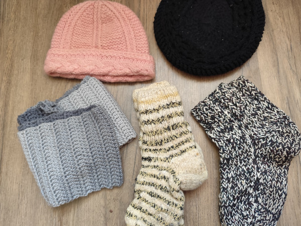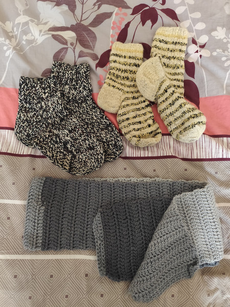 В'язані носки, пара - чоловічі 42-45р-р. і жіночі 37-39р-р, - в чудовому стані, без нюансів! Та новий, неймовірно гарний в'язаний шарф в стилі "омбре", дві теплі, в'язані шапки в гарному стані. На пакування