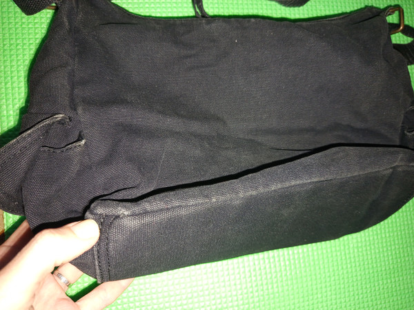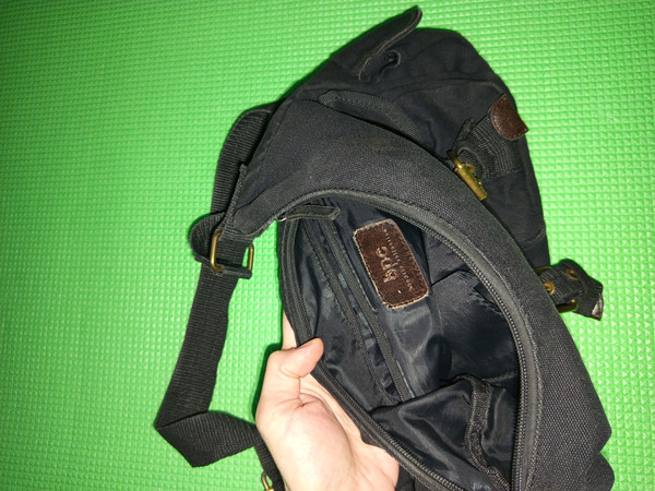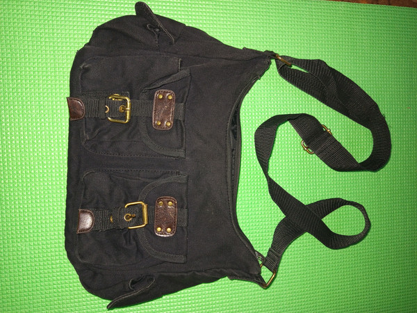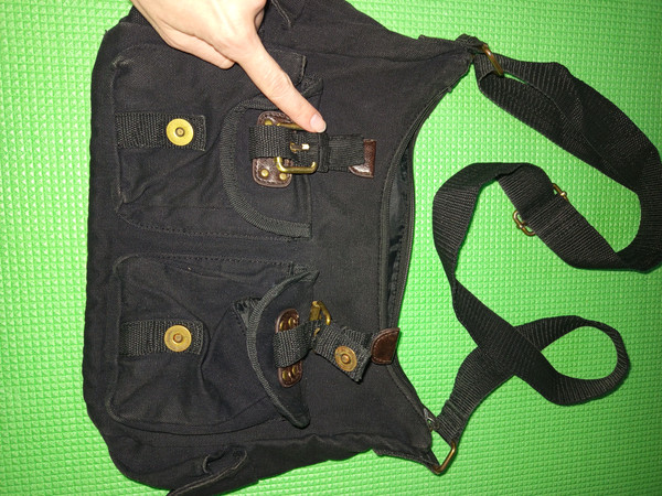Чорна текстильна сумочка з кишенями bpc з регульованою ручкою37х23смЗагубился один магнитТрохи утратила кольорЗзаду є маленька потертість.Молнії всі працюють.Виглядає гарно!Дуже вмістка.