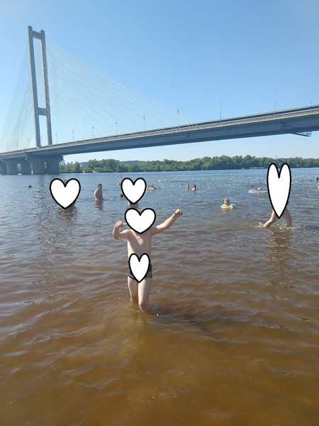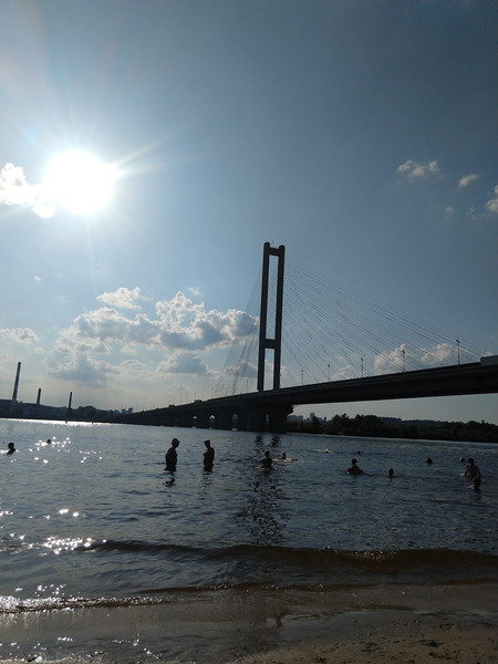 Вид на Південний міст з пляжу біля метро Славутич. Останні роки вода тут в Дніпрі надзвичайно брудна. Якщо раніше вона була зеленувата, але прозора, то зараз ось, як на нижньому фото.