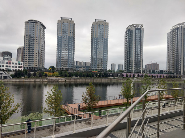 На цих перших фото - "шматочок Чикаго" в Києві, вигляд на ЖК Рівер Стоун зі сторони ТЦ Рівер Молл. Сучасна забудова з дуже дорогим житлом. Та що казати, якщо паркомісце під відкритим небом в кілька кв.м. в цьому закритому ЖК коштує від 15 тис.доларів, а в підземному паркінгу - від 50 тис.$.