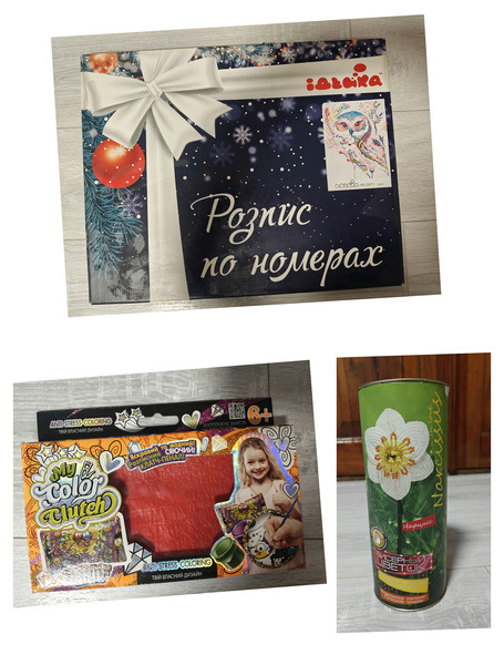 1) Картина розпис по номерах. Сова. Розмір 50*40. Набір новий, у користуванні не був. Але! Виготовлено у 2019 році, тобто вже протермінований і фарби мабуть засохли. Тому потрібно буде використовувати
