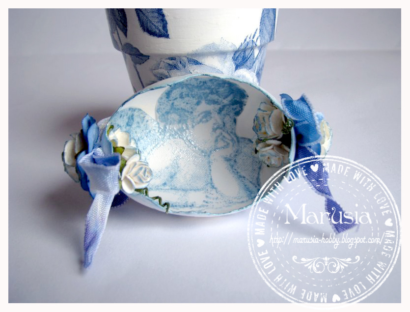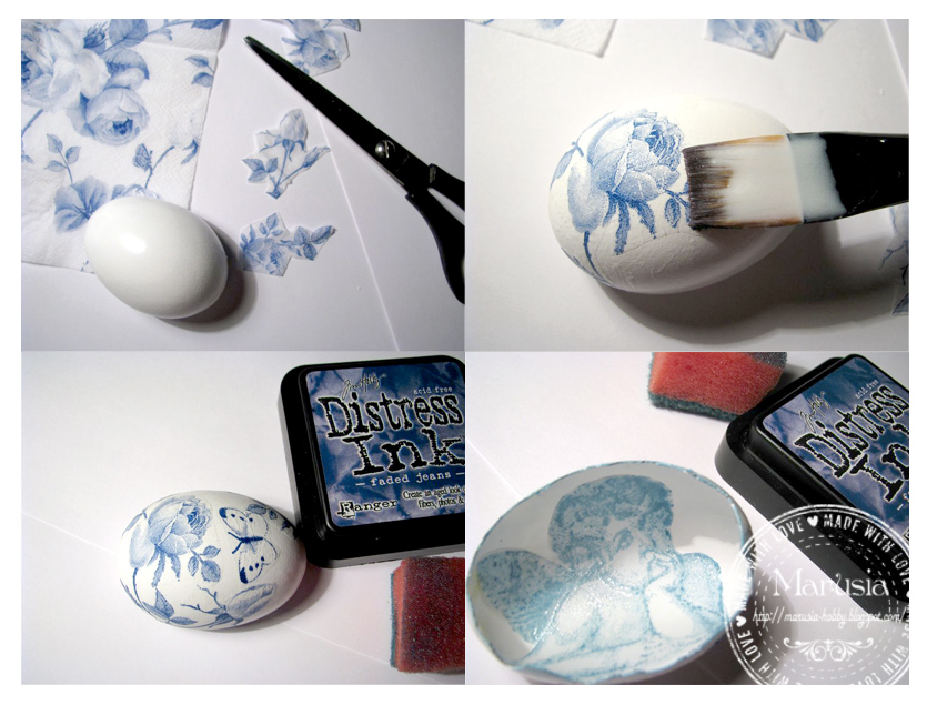 Этап 4. Выбираем салфетку с мелкими узорами, вырезаем детальки. Аккуратно приклеиваем фрагменты на клей ПВА на яйцо и горшочек. Тонируем край чернилами. Оставляем сохнуть.