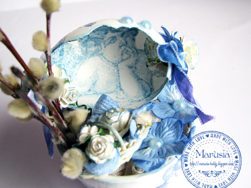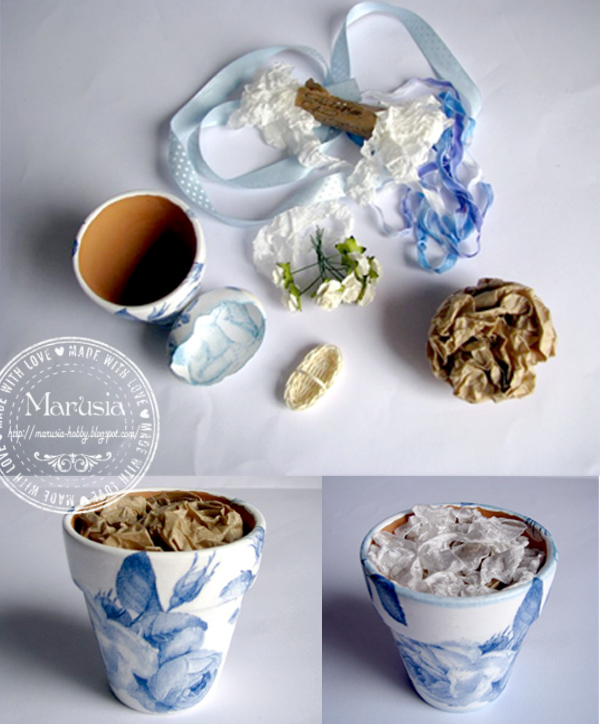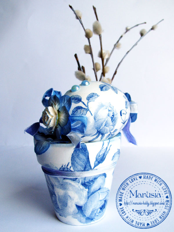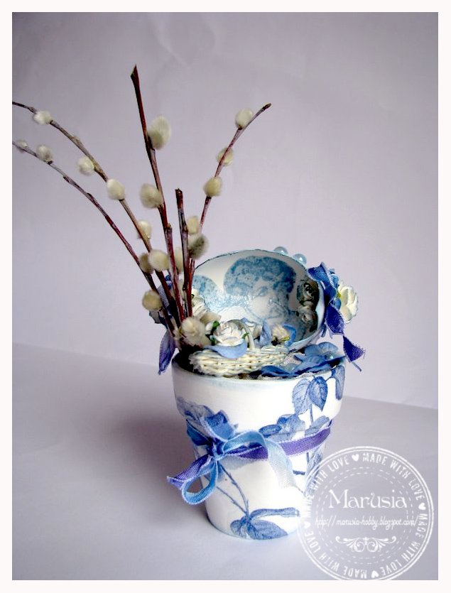 Для работы потребуются такие материалы: горшочек глиняный или его аналог (стаканчик, корзинка, баночка...), белая акриловая краска, акриловый лак, клей ПВА или клей для декупажа, клей Дракон, салфетка трехслойная, пустое куриное яйцо, калька, штампы, пудра для эмбоссинга, фен или утюг, чернила, ленты, цветы, полубусины, веточки вербы и разные украшения на свое усмотрение.
