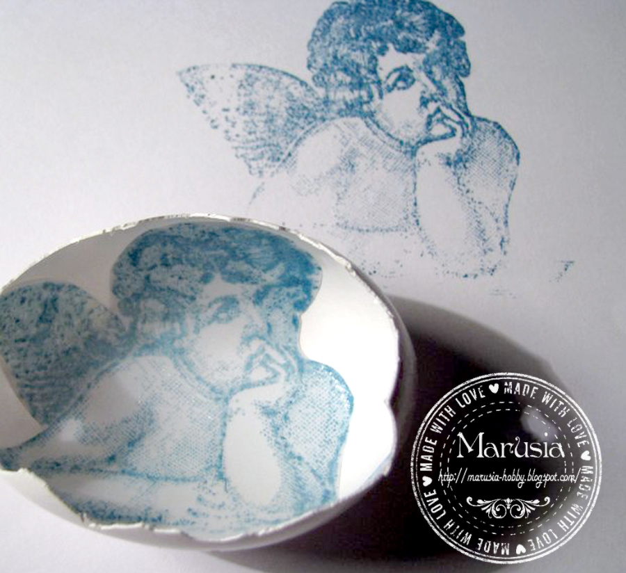Прикладываем картинку пудрой вверх на подошву утюга на пару секунд. Вырезаем ангела по контуру. Просто вставляем картинку во внутрь скорлупы.