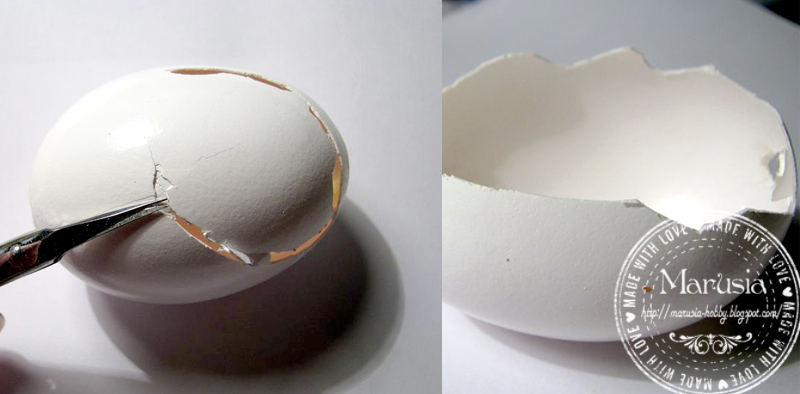 Этап 2. Резким точным движением пробиваем и разрезаем острыми ножницами скорлупу. Я использовала уже треснутую заготовку. Придаем красивую форму.