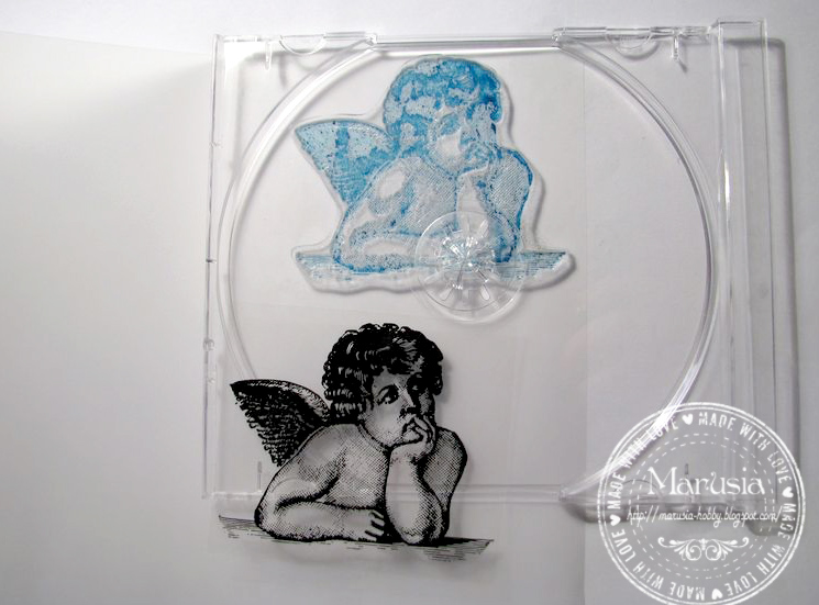 Коробочка от дисков это вместо акрилового блока, чтобы сделать оттиск, штамп. Экономлю) Делаю оттиск, посыпаю специальной пудрой, плавлю утюгом и картинка ангела готова.