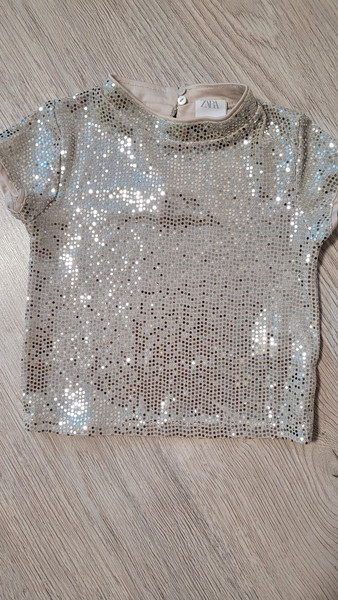 Топ Zara з пайеиками.Красивий бежевий подклад, а зверху золоті пайетки.Розмір на 130 см.Новий, без бумажної бірки.