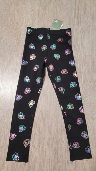 Красивые леггинсы Н&М для девочек  . Верхь-  хлопок , внутри мягкая баечка, в поясе резиночка для регулировки, украшенные цветными принтами.Размер 140 см на 9 - 10 лет.