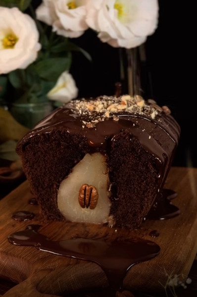 Сухі інгредієнти додала в рідку масу. У форму вилила половину тіста, вклала в нього половинки груш по колу, а зверху - знову тісто. Випікалося в духовці за температури 170° приблизно 50 хвилин. Згадала, що є шоколадна глазур. Полила нею. Кекс дуже ніжний і вологий. Думаю, що зі свіжими грушами та шоколадом (в оригіналі його розтопленим збивають із какао і молоком і додають у масляну суміш) було б ще смачніше. А ще можна, мабуть, спробувати з яблуками чи персиками замість груш або ж додати горішки на глазур. Чим цей рецепт класний? Бо швидко, легко і смачно:thumbsup: Можна приготувати навіть зранку:wink: