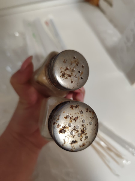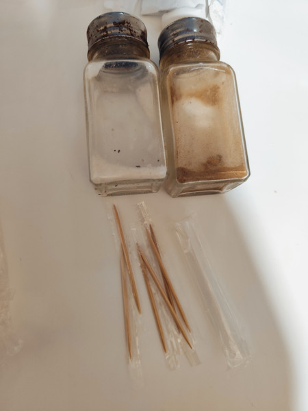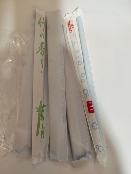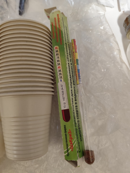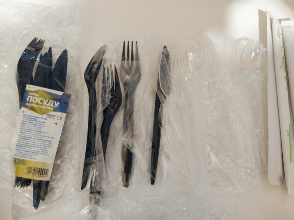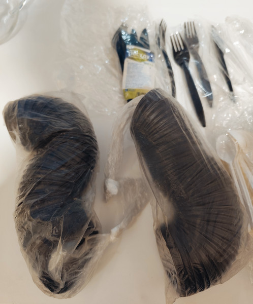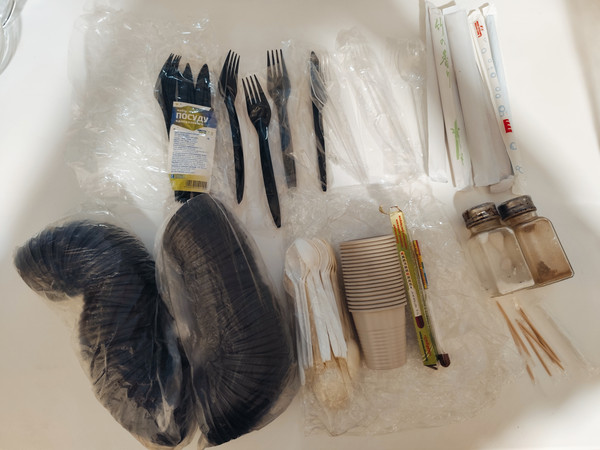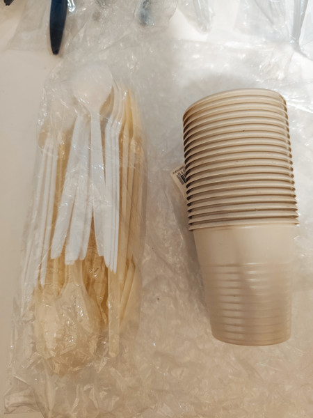 багато нового одноразового посуду - дві упаковки кришок на середню чашку десь по 50шт в кожній, вилки, ножі, ложки, багато чайних ложок, невеличкі стакани, трубки для напоїв та палички для суші, зубочистки упаковані, якась видвижна трубочка упакована, також новий спиртометр, дві класні скляні емкості для солі та перцю, трохи іржі на них - можна укусом прибрати, в мене закінчився, немає чим. На фото не все видно, але це все об'ємом з коробку для взуття. Попрошу на пакування 15