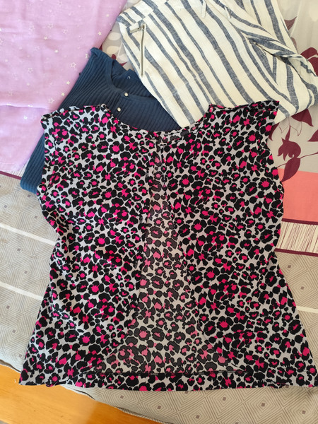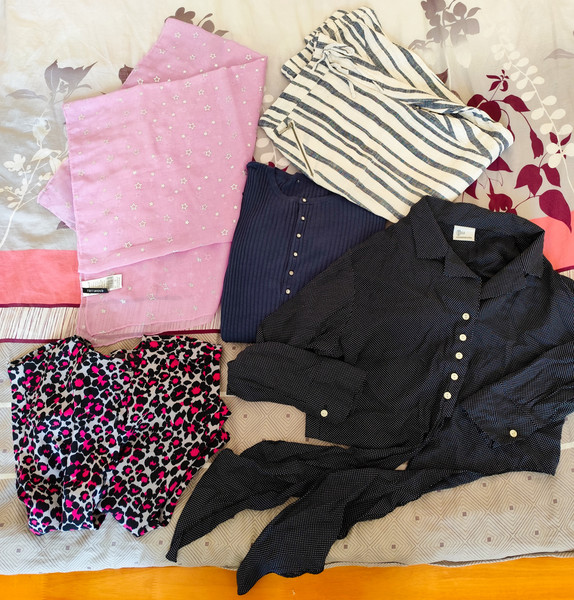 всі речі фірмові, сучасні, гарні та зручні - блуза як нова, обвязується по талії, класні домашні, легкі брючки, дуже класна жилеточка, шикарна тепла кофтинка в рубчик, класно тягнеться, облягає фігуру, та милий шарф платок теранова. Попрошу на пакування 25+дар промокод