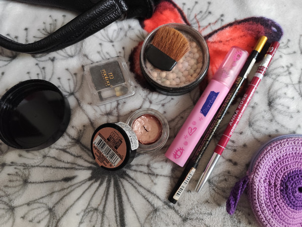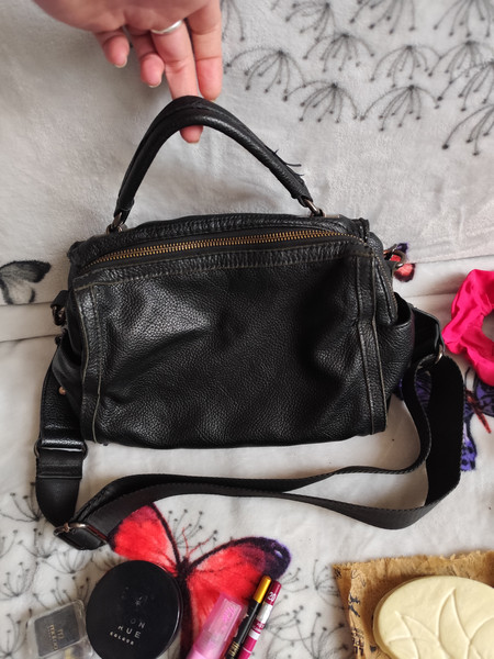 класная чорная крос боди сумка Braska - мягенькая, удобные ручки, много карманов, все молнии исправны и легко работают, из нюансов чуть потёртости возле молнии, не заметны. Много хороших резинок, крепкий кораблик, красивый обруч для волос, вязаный кошелек на молнии, мыло ароматное хендмейд красивое, косметика - румяна, тени, новые карандаши, тушь. Попрошу на упаковку35