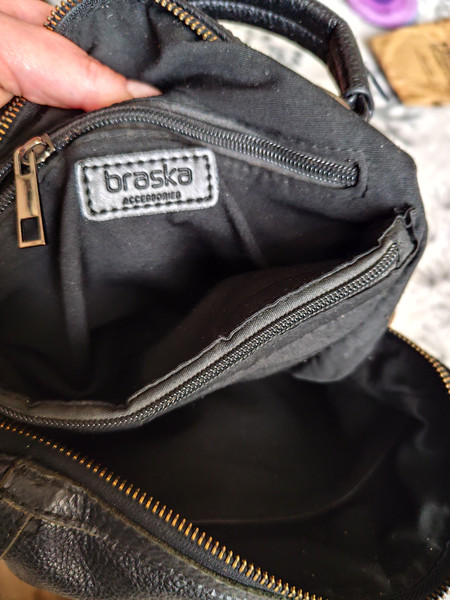 класная чорная крос боди сумка Braska - мягенькая, удобные ручки, много карманов, все молнии исправны и легко работают, из нюансов чуть потёртости возле молнии, не заметны. Много хороших резинок, крепкий кораблик, красивый обруч для волос, вязаный кошелек на молнии, мыло ароматное хендмейд красивое, косметика - румяна, тени, новые карандаши, тушь. Попрошу на упаковку35