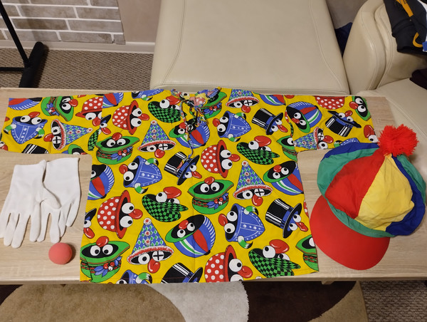 Ширина 54, довжина 55-56 - це кофтинка, стан чудовий; носик без резиночки, старенький, але "везучий" - дуже багато діток розважав))) - ще в нормальному стані, кашкет - супер!