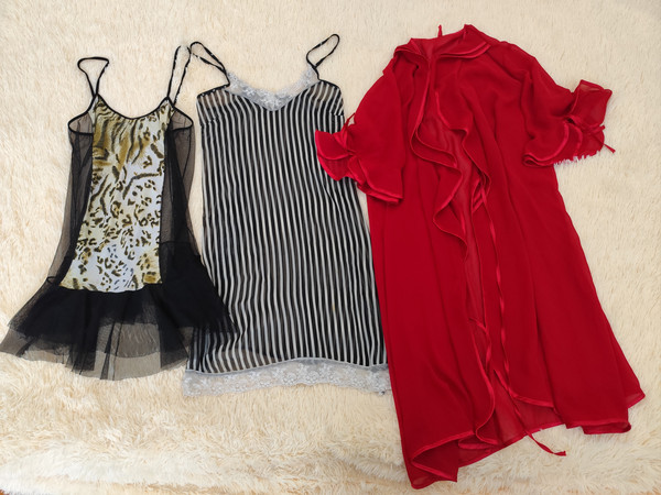 дуже гарні, привабливі, в чудовому стані, без нюансів - комбінація, пенюар, халатик. На розмір С або струнка М. Попрошу на пакування