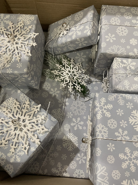 Величезна коробка, наповнена купою менших, естетично запакованих зі сніжинками та бубенцями.