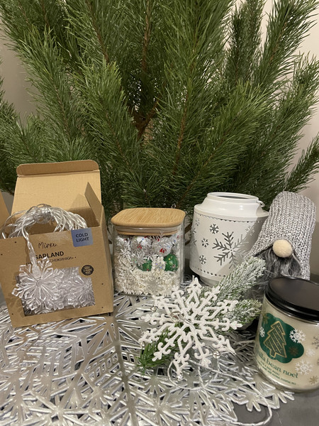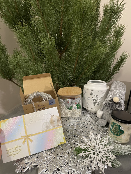 І купа подарунків, що гріють серце та створюють різдвяний настрій: гірлянда зі сніжинками ( суперська від USB), свічник, ароматна велика свічка у склі, чарівний гном, запашне мило- сніжинка, неймовірні підтарільники( теж сніжинки) та головна радість дітей - банка з шоколадними різдвяними кульками! І все в одному стилі та кольорі. Це мій перший Таємний Санта і він неймовірно мені догодив))).