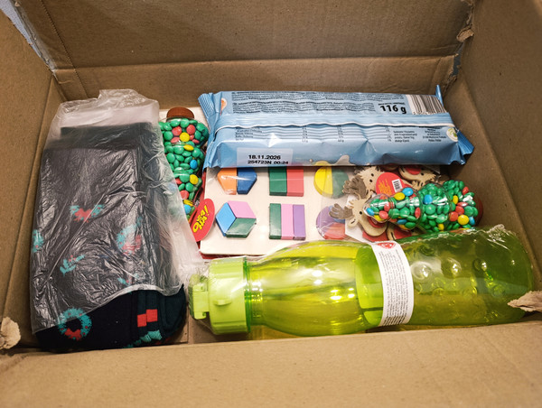 По наповненню: носочки новорічні, пляшка для води, косметичка, новорічний декор, дерев'яний пазл, печиво і ялиночка з солодким драже.