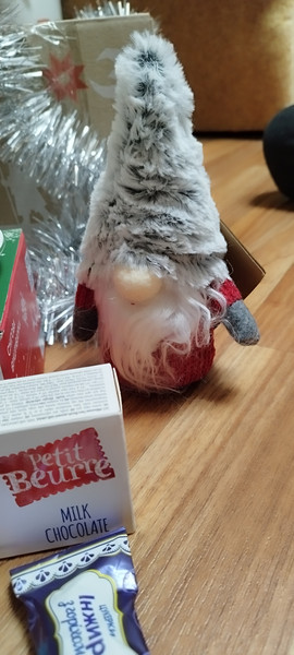 Такий гарний гномик вже стоїть на своєму місці біля ялинки. Гарним білосніжним горнятко з блюдцем вже користується донька. Цукерочки та печиво з запашним чаєм продегустували. І я Вам скажу це дуже смачно! А вино з набором для глінтвейну в бокалі ще чекає свого казкового часу!