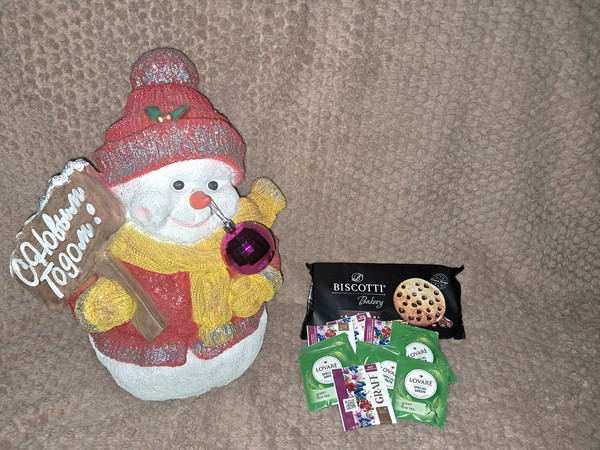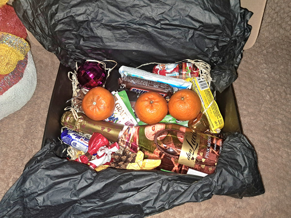 Да уж....Чай можна було і пачечку покласти, а не витягнути з дому частину. Хочеться спитати:"А де подарунок?", або від імені снігурочки Яни "я себе не обділив?"