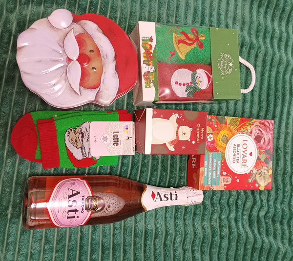 Цукерки в чудовому боксі, шампанське, чайок, свічка, носочки( розмір підходить), святкові рушники. Все святкове, яскраве. Кольорова гама підібрана!