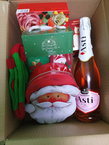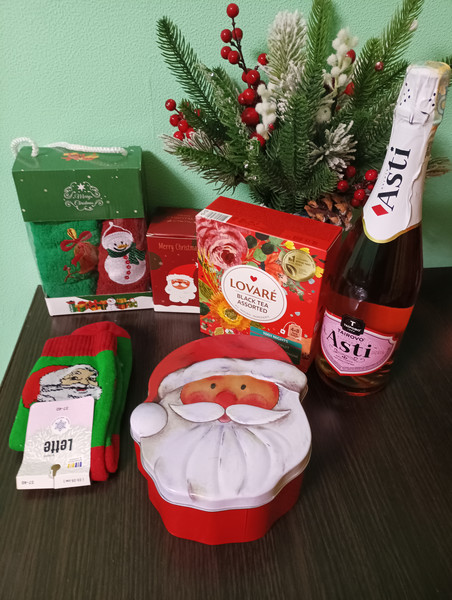 Вітаю вас))), подарунок дбайливий. От не знаю, хто як, а я маю сантимент до залізних коробок з вкусняхами, мені воно відгонить дитинством, пряниками німецькими, які побачив в каталогах Отто, і тому я кожен новий рік купляю печиво саме в залізяках))), шампань, навіть свічєчка в коробочці:grin: і з дзвіночком, вітаю, у Вас Снігуронька - господинька і хозяєчка, подбала про все, щоб і тепло, і радісно, і смачно, і чайок Ловаре :wink: тільки гарні слова, бо фанати бдять:laughing: