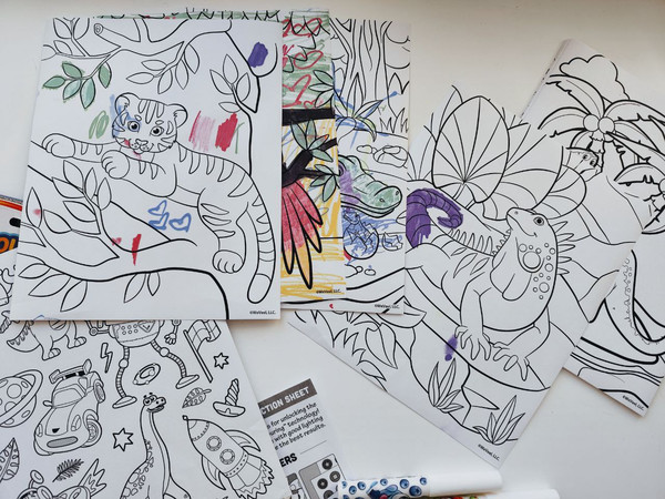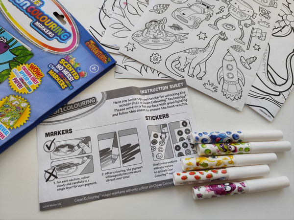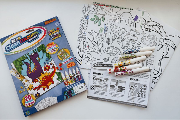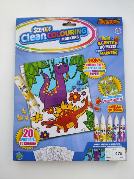 Це ароматний набір для творчості Scentos Clean Colouring "Захоплюючі пригоди". Включає 20 розмальовок розміром 20 х 25 см, 5 чарівних маркерів та наліпки.Маркери працюють лише на спеціальному папері, не залишаючи плям на шкірі, тканинах чи меблях.Кольори проявляються лише на спеціальному папері Clean Colouring.Набір призначений для дітей віком від 3 років.Дозволяє познайомитися зі світом тварин, птахів та динозаврів через розмальовки. Попрошу на пакування