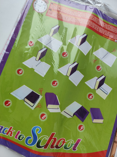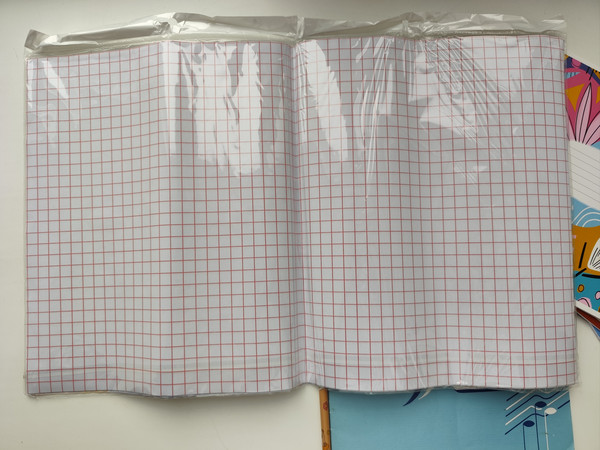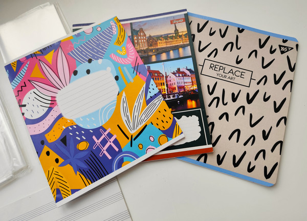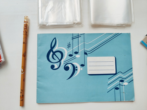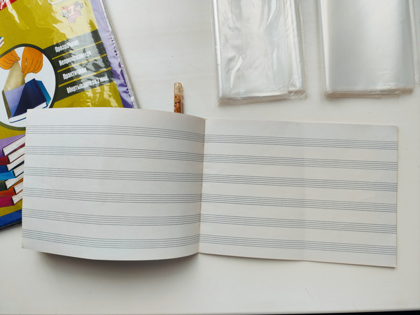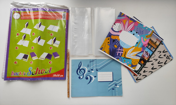Нові книжкові обкладинки, зошити - два в клітинку, один в лінію, також зошит для записів нот, олівець - усе нове. Попрошу на пакування