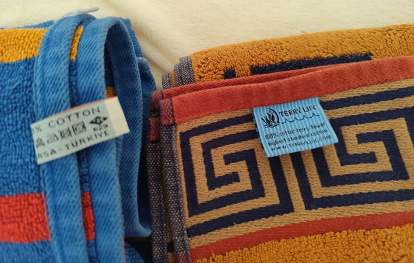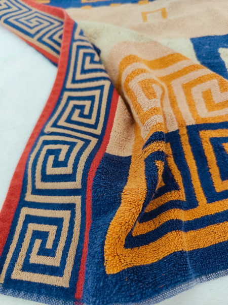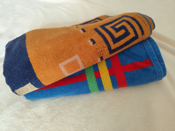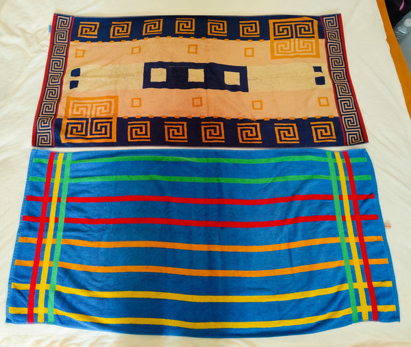 два махрових, дуже якісних (ще тої якості, що була колись) рушника. Чоловічі, яскраві - без плям чи дирок, в дуже гарному стані! На фото так вийшло, бо падає тінь. Розмір повинен бути по стандарту 120*60см, але вони по 10см чогось довше. Попрошу на пакування