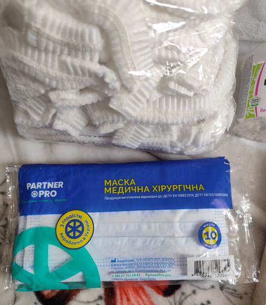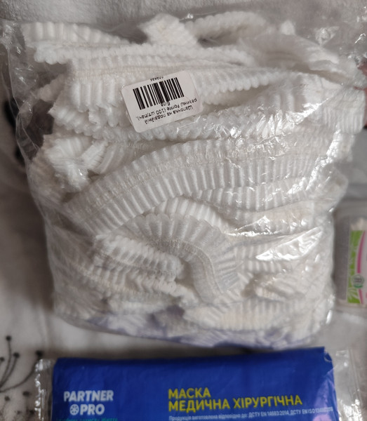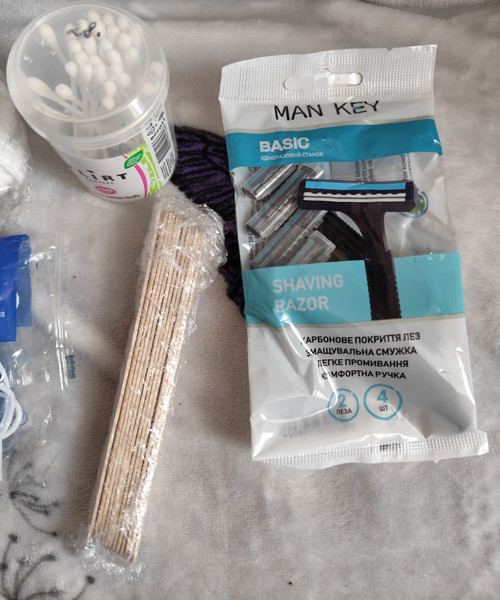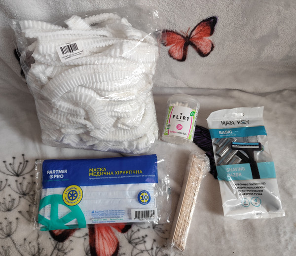 шапочки упаковка 100шт - взято декілька, перераховувати не буду, немає часу, маски без однієї - 9шт, трохи ватних паличок, дерев'яних лопаток, новий набір станків для гоління. Попрошу на пакування