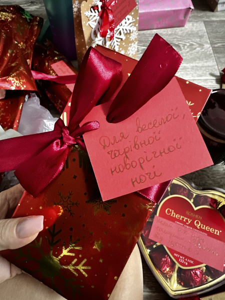 Подарунок я отримала свій ще до Нового року та вирішила лишити під ялинкою. :slight_smile: Останні роки брала участь і завжди було приємно його відкривати усією родиною в новорічну ніч. Коробочка була не дуже великою проте гарно обгорнутою.